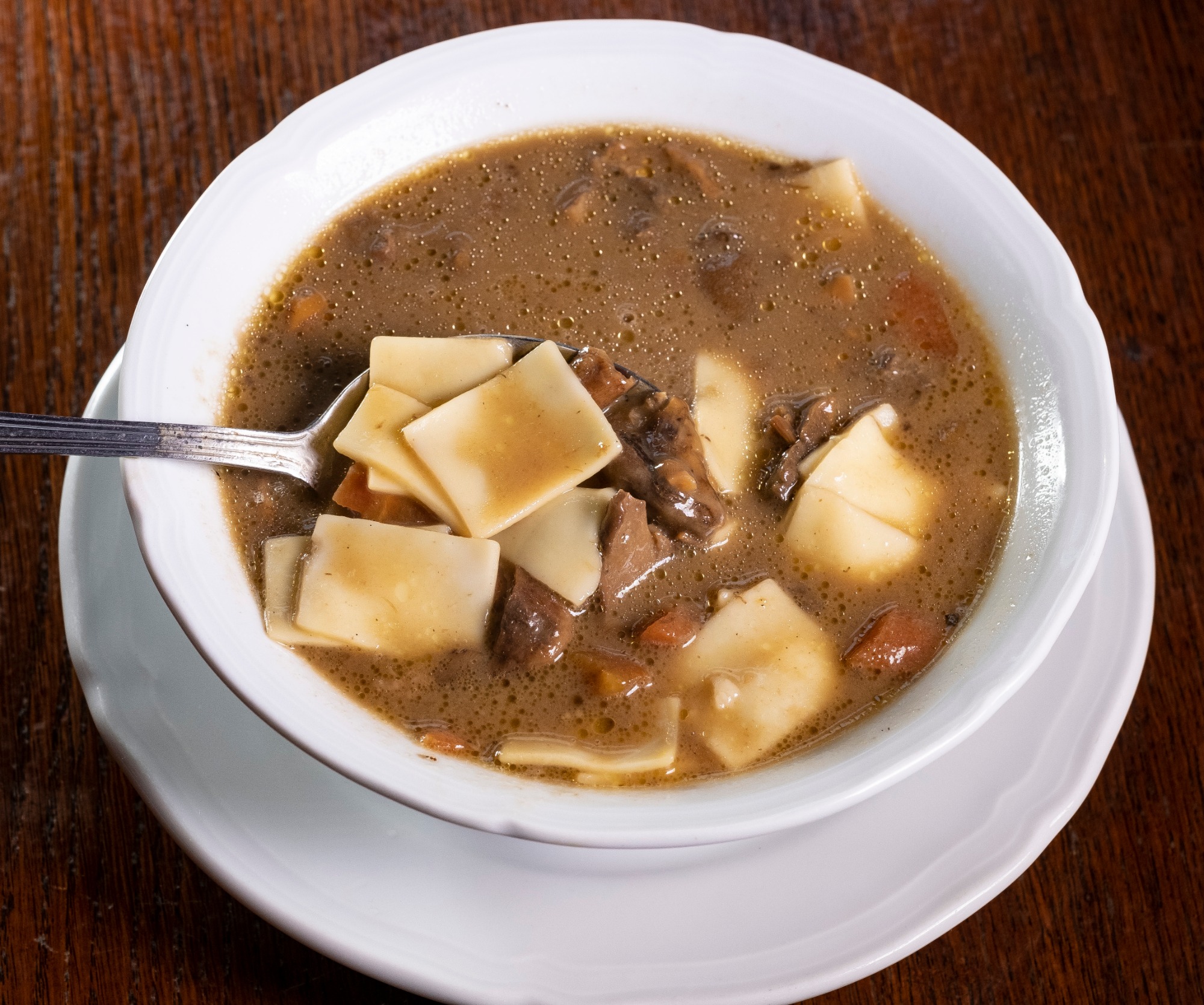 Zupa borowikowa z łazankami. Panierowany karp z cebulą, ziemniaki, surówka z kiszonej kapusty.